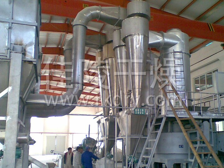 流化床干燥機是由物料自進料進口進入機內,在振動力作用下,物料沿水平面流化床拋擲,向前連續運動,熱風向上穿過流化床同濕物料換熱后,濕空氣經旋風